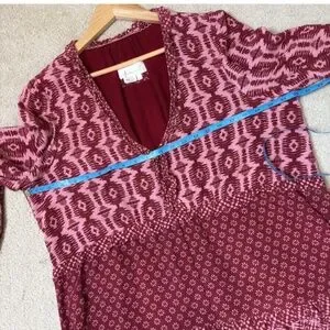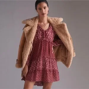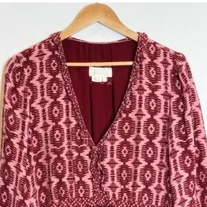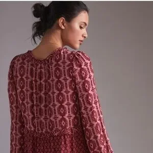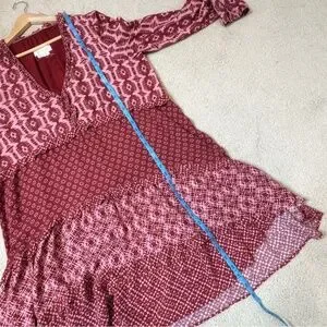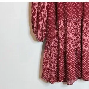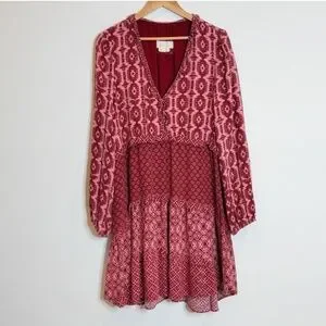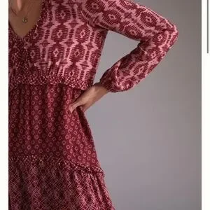 Anthropologie Dress Long Sleeve Tiered Skirt V-Neck Mini Knee Length Wine Berry Loose Fit Size Large