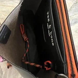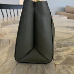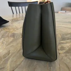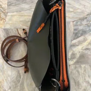 Olive green with brown strap and black interior. Padded phone compartment, branded logo carabiner. Front hidden magnetic closure. Gunmetal Hardware.