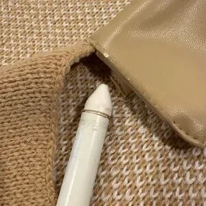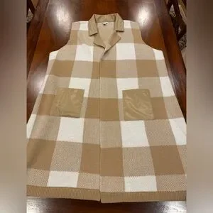 New!! One call out mini dot on collar(see photo)manufacturer defect. Sophisticated sweater vest with tan and cream checkered pattern. Very soft knit , Faux leather collar & pockets. Ideal for versatile wear.
