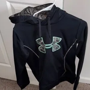 Black hoodie with camo accents and mint Under Armour logo. Comfortable and stylish.