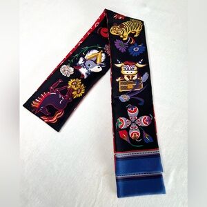 Elegant silk scarf with vibrant animal motifs. Features bold colors and intricate designs. Ideal for a stylish accent.