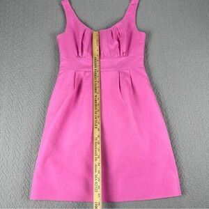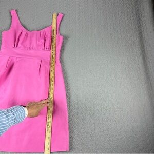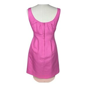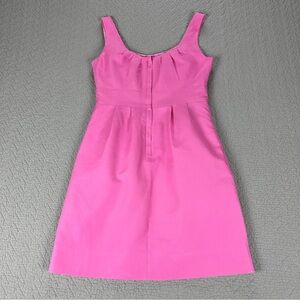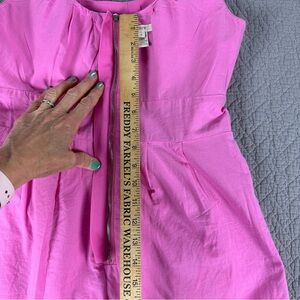 This J. Crew dress has a classic, sleeveless design with a flattering scoop neckline and a defined waist. The bodice features subtle pleating while the skirt is simple, slightly flared and about knee-length. The fabric is great- a substantial 100% cotton with 100% cotton lining that holds shape. The pink is gorgeous and so fun- it brings a little whimsy to a classic silhouette.