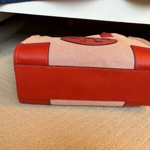 Stylish Tory Burch tote. Features red leather accents. Coral/ Redish woven body. Iconic logo design. Smoke & pet free home.