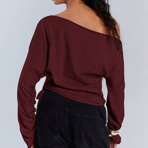 burgundy Casual Women's Asymmetric Collar Drawstring Top