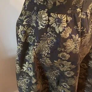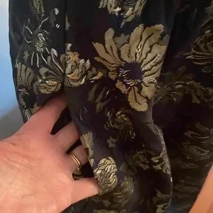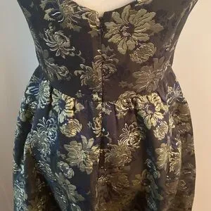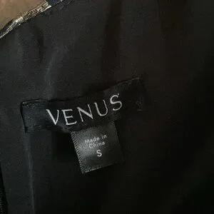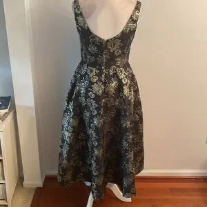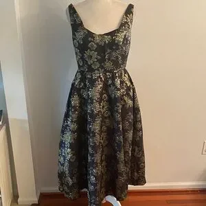 Size 4 black Venus fit and flare dress. Back zipper/lined. Has Pockets! Black background with gold iridescent flowers and dark blue pattern intertwined. Beautiful! 47 inches long 17 inches pit to pit lying flat. 15 inch waistline lying flat worn once. Excellent condition!