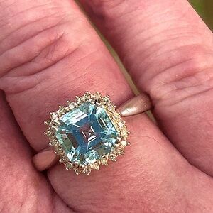 An @8.5mm Ascher cut Swiss blue topaz (@3.5CT) surrounded by a halo of 24 beautiful genuine diamonds. All @1.2mm or @.01ct each. (Approx .24ctw diamonds)