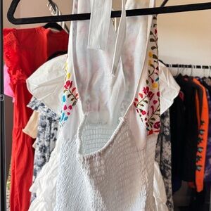 White dress featuring vibrant floral embroidery. Perfect for a stylish look.