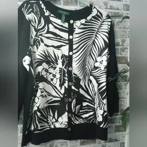 Ralph Lauren Black and White Botanical Cardigan Sweater