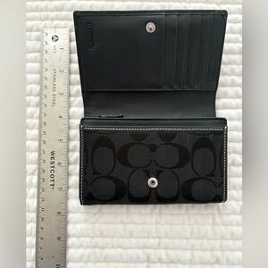 Elegant Coach wallet with signature pattern. Features a sleek black design.