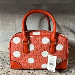 Chic Michael Kors satchel with bold polka dots. Features a vibrant red and white design. Ideal for a stylish statement.