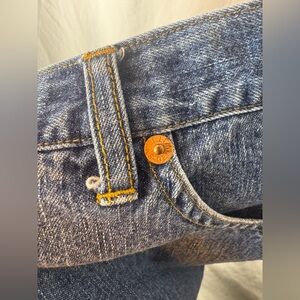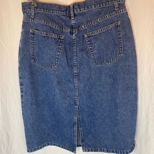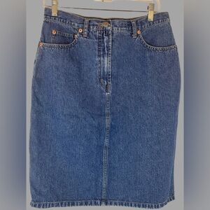Classic blue denim skirt with a straight fit. Features a button and zip closure.