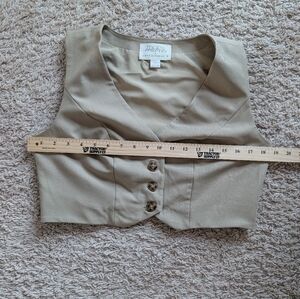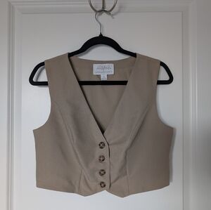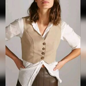 Anthropologie, Mare Mare, vest, waistcoat, cropped, tailored, tan, beige, neutral, V-neck, button-front, minimalist, classic, preppy, light academia, business casual, office wear, layering piece, Medium.