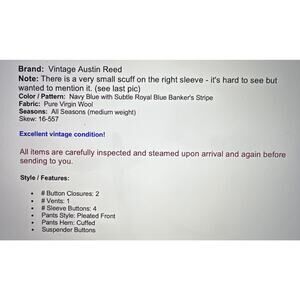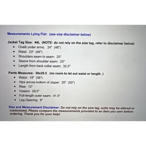 Size and Measurement Disclaimer: Do not rely on the size tag, suits may be altered or customized.