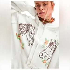 Stay cozy and stylish with this white hoodie featuring a unique embroidered horse and floral design. Perfect for casual outings.