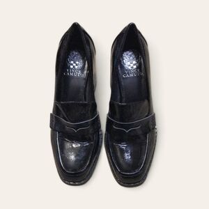Elegant black patent leather loafers. Chunky heel design. Perfect for versatile styling.