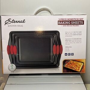 Eternal 3-piece nonstick baking sheets with silicone red handles. Ideal for baking.
