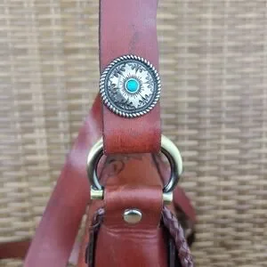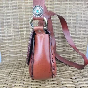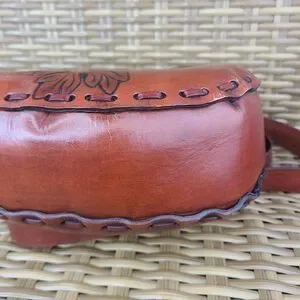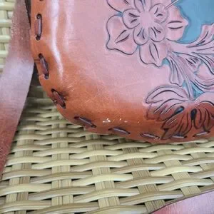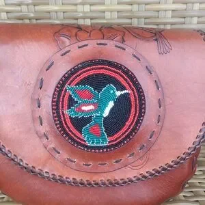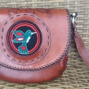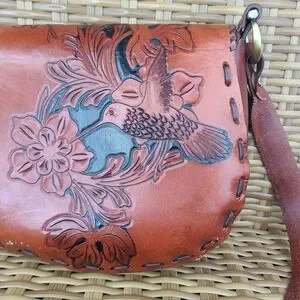 Handmade brown leather crossbody bag. Red, teal, and white beaded humming bird design on the front side. Tooled embossed humming bird floral print on the backside. Silver tone hardware. Suede finish on the interior. Main compartment has fold over style closure with snap f. Western appeal. There is some small white marks on back side. Please see all photos.