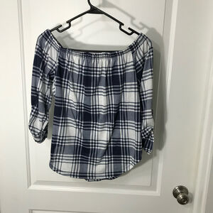 Polly & Esther Navy & White Plaid Off-Shoulder Top Size Med