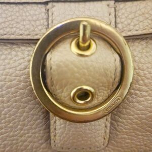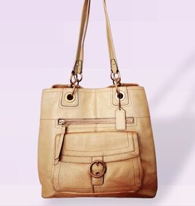 This Coach F18890 Penelope Leather Tote is a Champagne, large-sized shoulder bag made of leather. It features two exterior pockets, one with a twist-lock closure and one with a zipper, and a spacious interior with two main compartments separated by a zipper pocket. The interior also includes an additional zipper pocket and two slip pockets. Goldtone Hardware