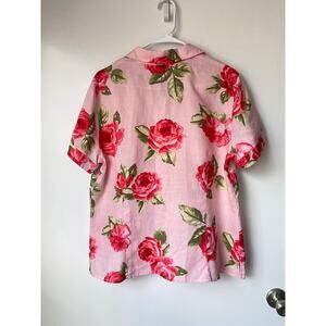 100% linen floral button-up shirt by Liz Claiborne. Size 14 (L). Features vibrant red roses on a pink background — perfect for cottagecore, romantic, coquette or grandma-core aesthetics. Button tab short sleeves, relaxed fit.