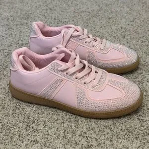 Sparkle with every step in these pink glitter sneakers. Perfect for adding a touch of fun to any outfit.