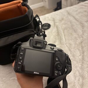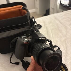 Nikon DSLR camera in sleek black. Includes a case with orange interior. Ideal for capturing high-quality images.