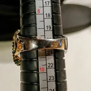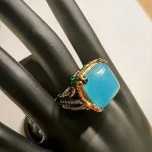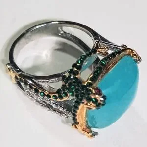 This stunning ring features a vibrant turquoise colored stone accented by a gold gecko design with green stones and red stones for eyes. Perfect for adding a unique touch to any outfit. Size 9.