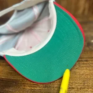 Vintage • Halliburton Trucker Hat • Snapback Adjustable • Adult Large, fits 7 1/8 – 7 5/8 • Red / White • Mesh Back • Foam Front • Halliburton Logo Patch • Made in USA • Green Underbrim • Oilfield Workwear • 80s 90s Style