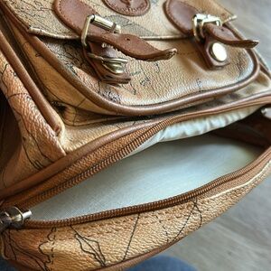 Vintage 90s antique world map faux leather backpack with four zippered pockets and one snap pocket and large gold tone hardware handle on top
