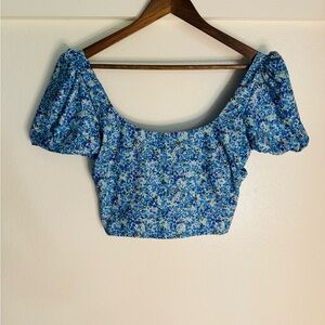 Splendid Blue Floral Longline Puff Sleeve Bikini Top - Size Large
