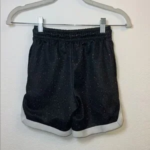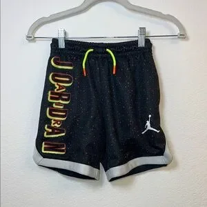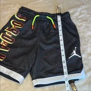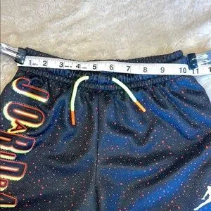 Black shorts with vibrant neon lettering. White logo and trim. Comfortable for active wear.