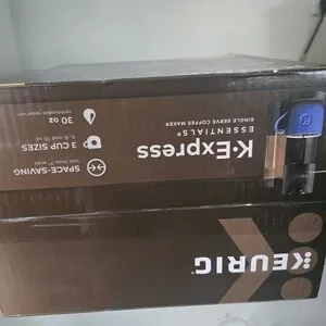 Keurig K-Express Essentials single serve coffee maker. Sleek black design with space-saving features. Includes a removable reservoir and three cup sizes.
