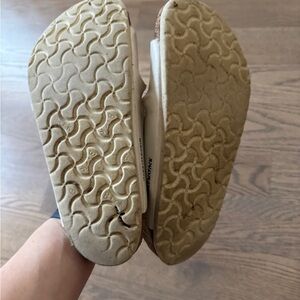 Classic Arizona Birkenstock. White leather upper. Well-loved.