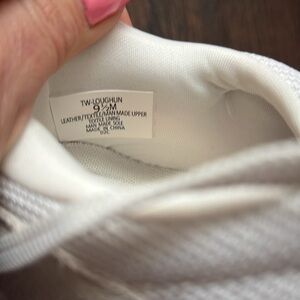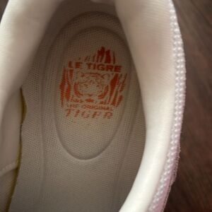 This is a pair of white Le Tigre brand sneakers in a size 9.5.