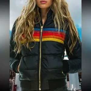 Stay stylish and warm with this vibrant women's jacket featuring colorful stripes. Perfect for adding a pop of color to your wardrobe.