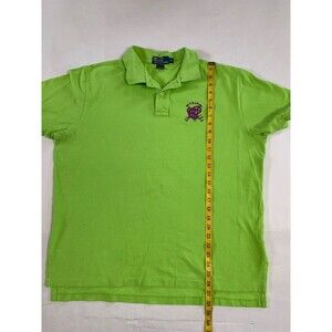 This is a Ralph Lauren Polo Shirt for men in size XL, featuring a solid green color with a big logo design. Made of cotton knit fabric with a collared neckline, short sleeves, and button closure. Suitable for travel, activewear, and casual occasions, it has a classic preppy style with embroidered accents. Ideal for all seasons, this breathable shirt is perfect for activities like rugby, golf, walking, and hiking.