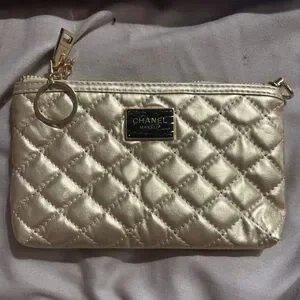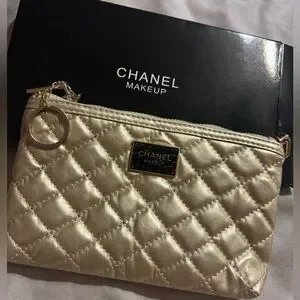 Luxurious Chanel cosmetic bag in gold. Quilted design with elegant finish. Ideal for makeup essentials.