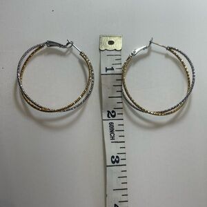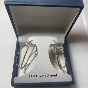 Elegant 14KT gold plated hoop earrings featuring a stunning combination of silver and gold tones. Perfect for adding a touch of sophistication to any outfit. Never worn . Very pretty and sparkly.