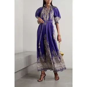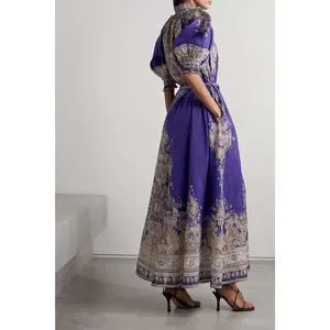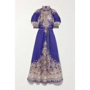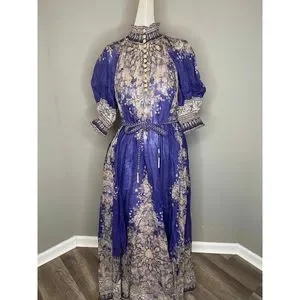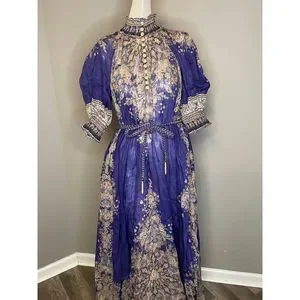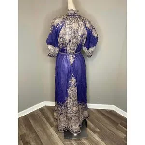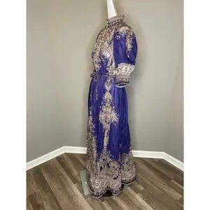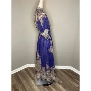 Elegant blue maxi dress with intricate gold patterns. Features puff sleeves and a high neckline. Perfect for special occasions.