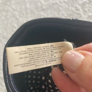 Elegant cotton/poly tote by Kate Spade. Features a front zipper pocket, inside zippered pocket and dual cowhide handles and trim. Polka dot lining. Can be worn on shoulder. Measures about 16 inches wide and 13 inches tall. Gently used. Slight scratch near bottom won’t affect wear.