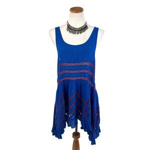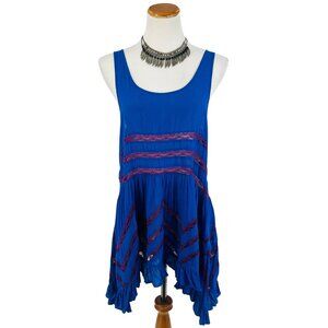 In a realm of dreams where fashion and whimsy intertwine, this Free People slip dress emerges like a vivid story. Its blue and purple hues dance with elegance, while intricate lace patterns whisper tales of bohemian artistry. A ruffled hem adds a playful twist, as each wear invites a new journey.