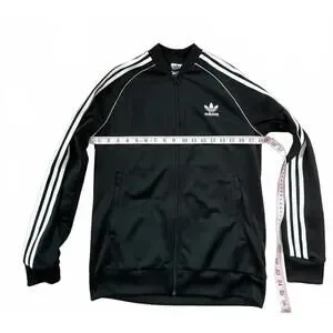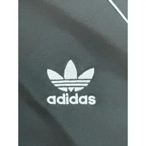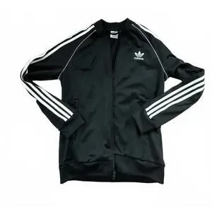 Elevate your activewear collection with this stylish Adidas Black Track Jacket. Featuring iconic white stripes along the sleeves, this jacket is perfect for workouts or casual outings. The lightweight material ensures breathability, while the full zip design provides versatility in styling. - Made from comfortable polyester blend - Machine washable for easy care - Ribbed cuffs and hem for a secure fit - Adidas logo for authentic branding - Available in medium size (UK 12 / US 8)
