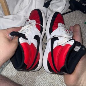 Stylish Nike high-top sneakers in red and black. Features a classic design with a bold swoosh logo.
