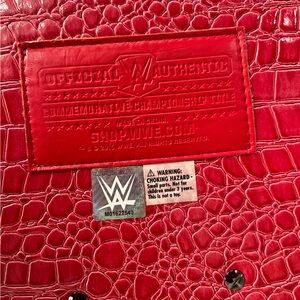 Official WWE authentic championship title. Bold red design with textured pattern.