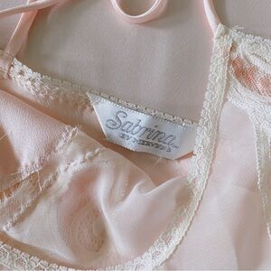 Delicate satin slip with lace details and see through panels at the hips and bust. Soft pink satin like fabric and white hues of lace. Perfect for a luxurious feel in the bedroom or to dress up creatively.