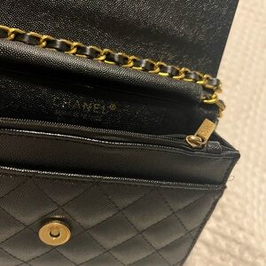 Elegant CHANEL shoulder bag in black quilted leather. Features a gold chain strap and iconic logo. Ideal for stylish occasions. Not authentic. Used a few times. Mint condition.