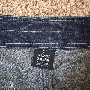 KUHL dark blue denim jeans. Slight distressing around knees.