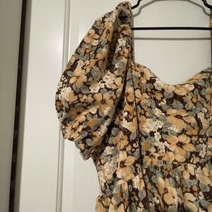 Embrace elegance with this floral puff sleeve dress. The intricate pattern features shades of cream and brown, perfect for any occasion.