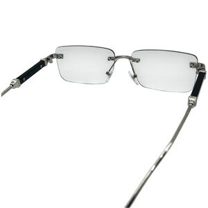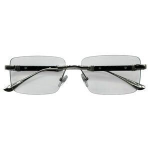 Cartier rimless eyeglasses in black and silver with rectangular lenses — features “Cartier” engraved on the top left corner of the left lens.