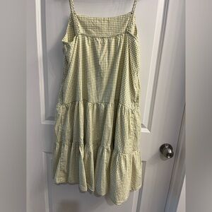 A favorite of mine that no longer fits! Dress has pockets, adjustable straps, and flattering tiered details. Gingham print in chartreuse green and white is so cute! Lightweight for summer and I’ve layered with tees and sweaters into cooler weather. Length from pit to hem (not including adjustable straps!) is about 29 inches. I’m 5ft 7 and dress came down to almost mid shin on me.